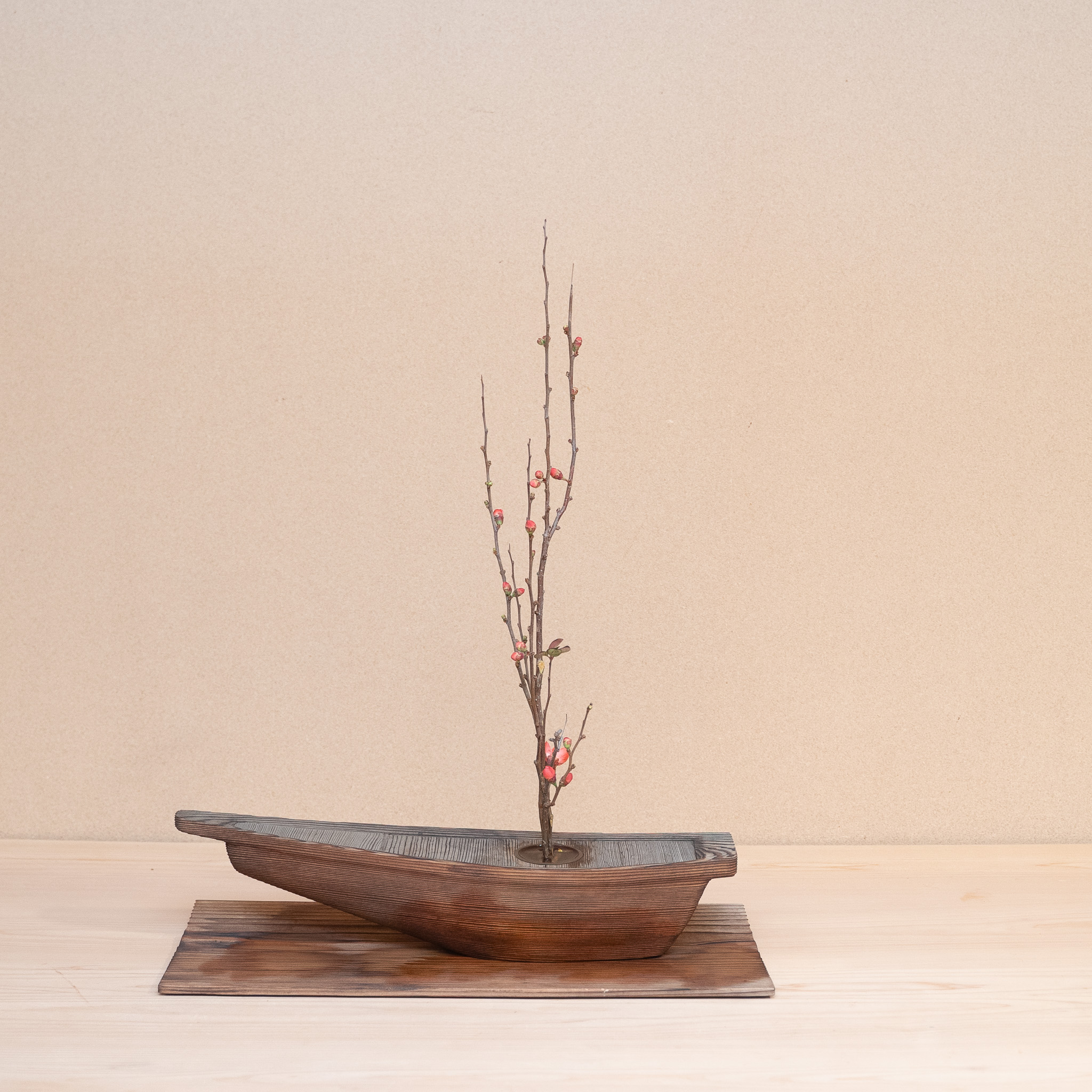 This is a special style of ikebana called “Tomaribune”. In ikebana, we usually do not make shapes with flowers, but Tomaribune is the only exception. Flowers are arranged like sails in a boat-shaped container to show a ship at rest.